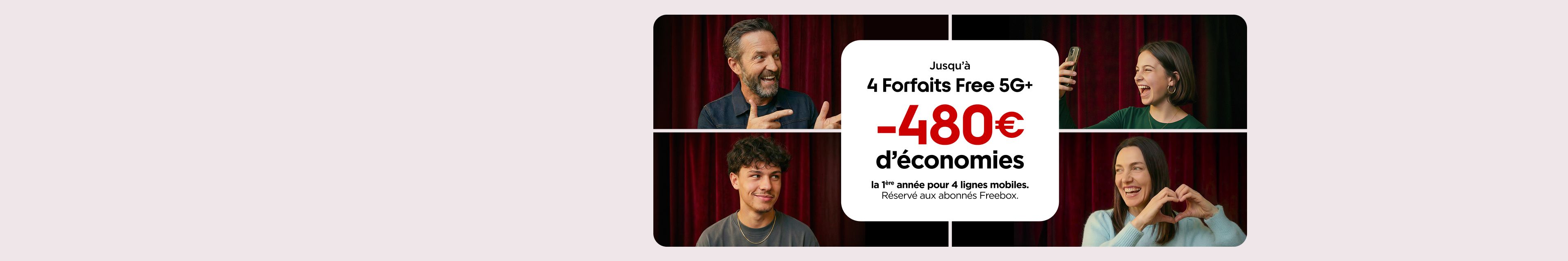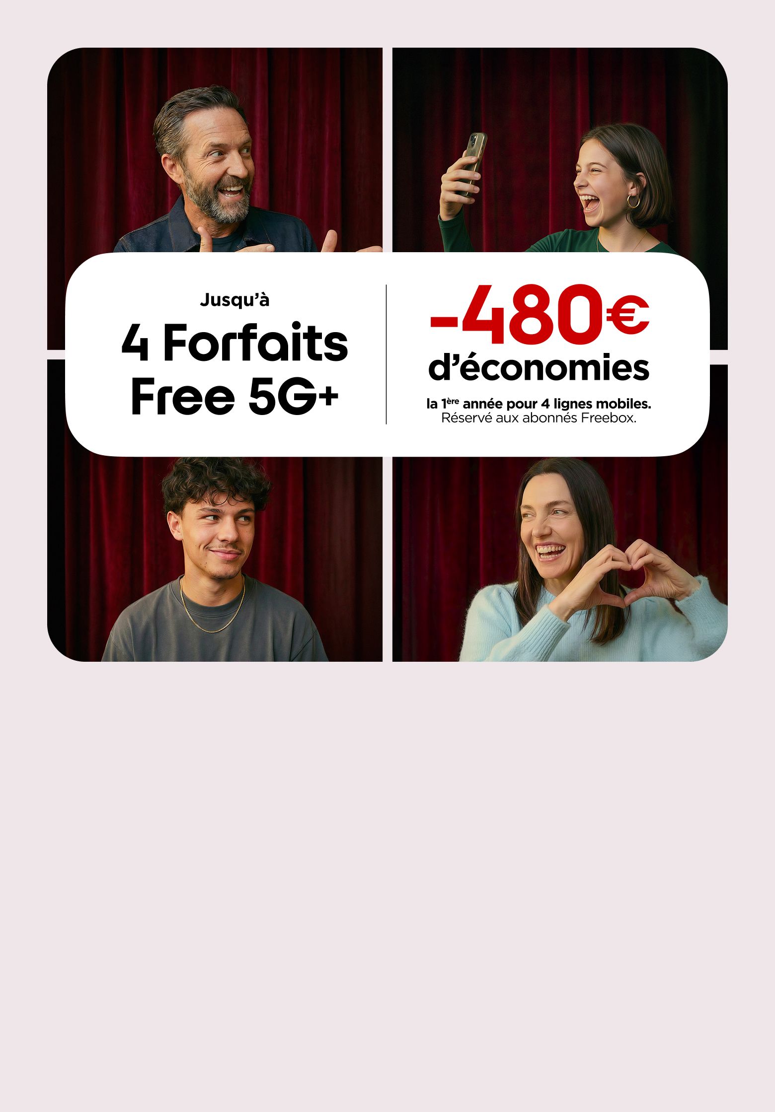 La réduction de 10€/mois pendant un an est valable une seule fois sur les 4 Forfaits Free 5G+ et sous réserve de rattachement à l’offre Freebox ou Box 5G dans un délai de 1 an à compter de la souscription au Forfait Free 5G+. Pour les Forfaits Free 5G+ souscrits avant la souscription à une Freebox ou une Box 5G et avant le 01/10/2024 : 15,99€/mois, soit une réduction de 4€/mois. Réductions valables dans la limite de 4 Forfaits Free 5G+.